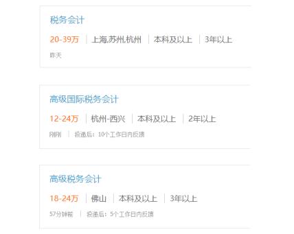 在主流招聘网站查找关于税务会计师的招聘信息发现,无论是一线城市还是二线城市,税务会计的薪资普遍高于普通会计: