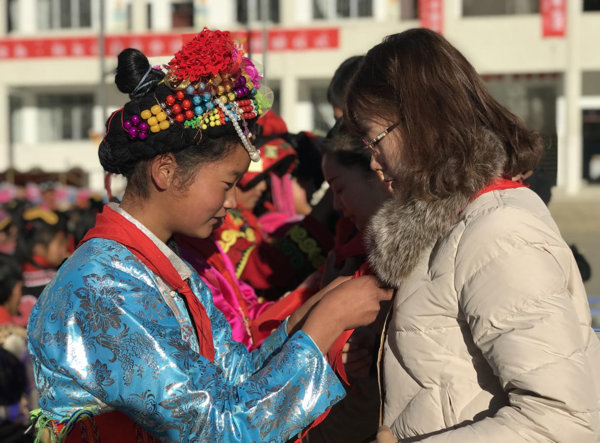 (受援学生给来自四川的税友志愿者,挂上红领巾)